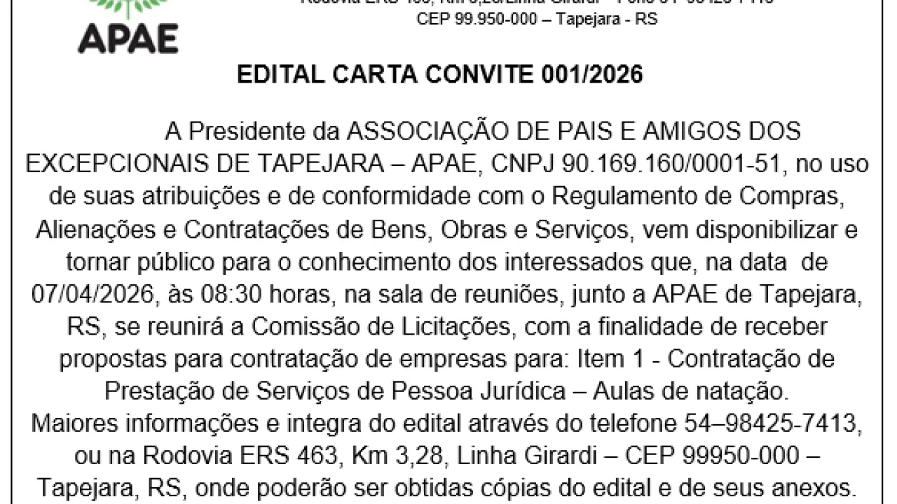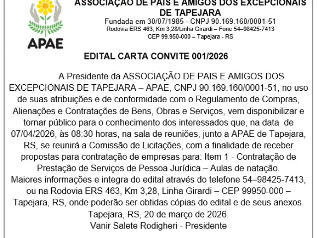 A Presidente da ASSOCIAÇÃO DE PAIS E AMIGOS DOS EXCEPCIONAIS DE TAPEJARA – APAE, CNPJ 90.169.160/0001-51, no uso de suas atribuições e de conformidade com o Regulamento de Compras, Alienações e Contratações de Bens, Obras e Serviços, vem disponibilizar e tornar público para o conhecimento dos interessados que, na data de 07/04/2026, às 08:30 horas, na sala de reuniões, junto a APAE de Tapejara, RS, se reunirá a Comissão de Licitações, com a finalidade de receber propostas para contratação de empresas para: Item 1 - Contratação de Prestação de Serviços de Pessoa Jurídica – Aulas de natação.